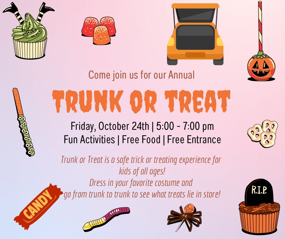 TRUNK OR TREAT—We are so excited to offer this fun event to the community again! Our annual Trunk or Treat will be Friday, October 24th from 5-7 pm in the church parking lot. Last year we shared