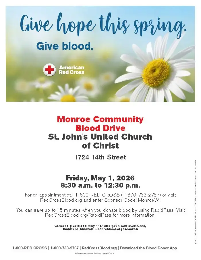 St John's Church will be having a Red Cross Blood Drive on Friday, May 1st from 8:30-12:30. Call 1-800-redcross or go to www.redcrossblood.org with code monroewi to schedule your appointment.